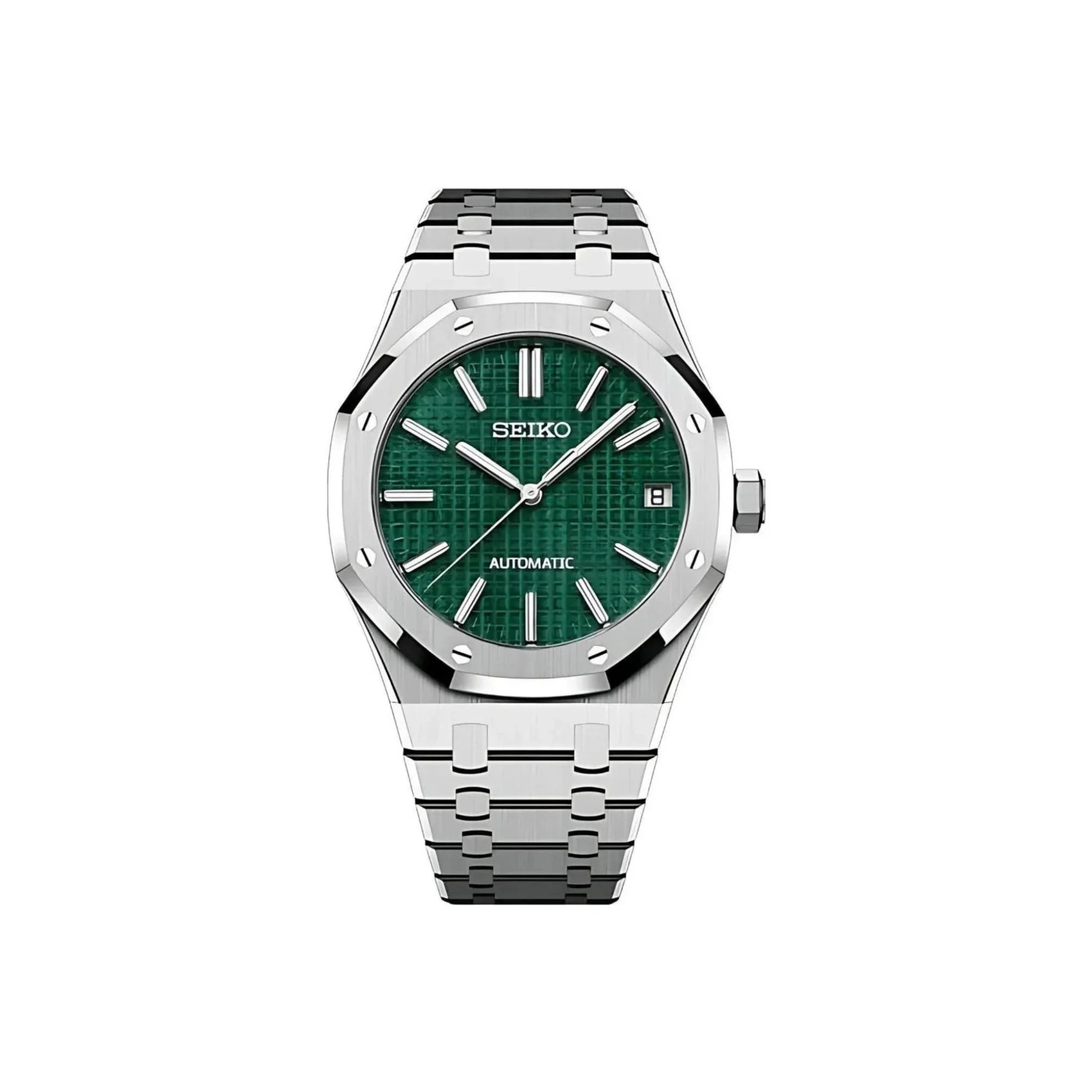 Inspired by the iconic Royal Oak design, and featuring the prestigious Seiko NH35 automatic movement, we present the Seiko Mod Royal Oak. A 41 mm high-end quality watch combining the perfect alliance between excellence and accessibility.