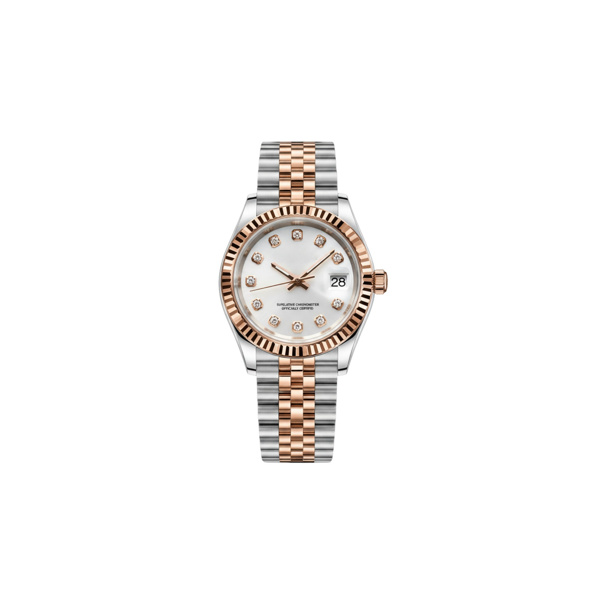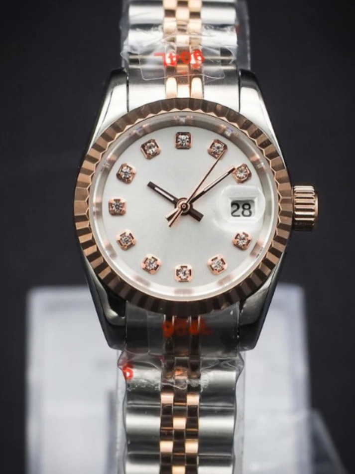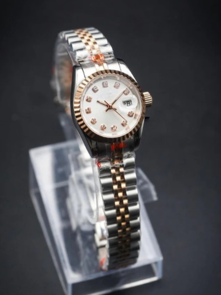 Modelled after the well known Women's Datejust watch, this Seiko Modded watch utilizes the reliable Seiko NH05 automatic movement. The timepiece features a two tone rose gold finish and a reflective choclate face with rose jewel accents, perfect for those who appreciate both craftsmanship and a refined luxury aesthetic.