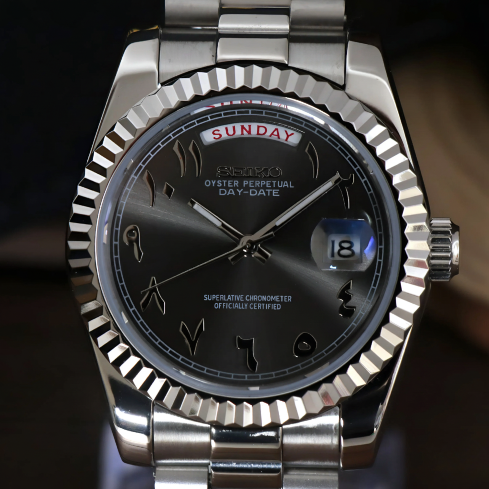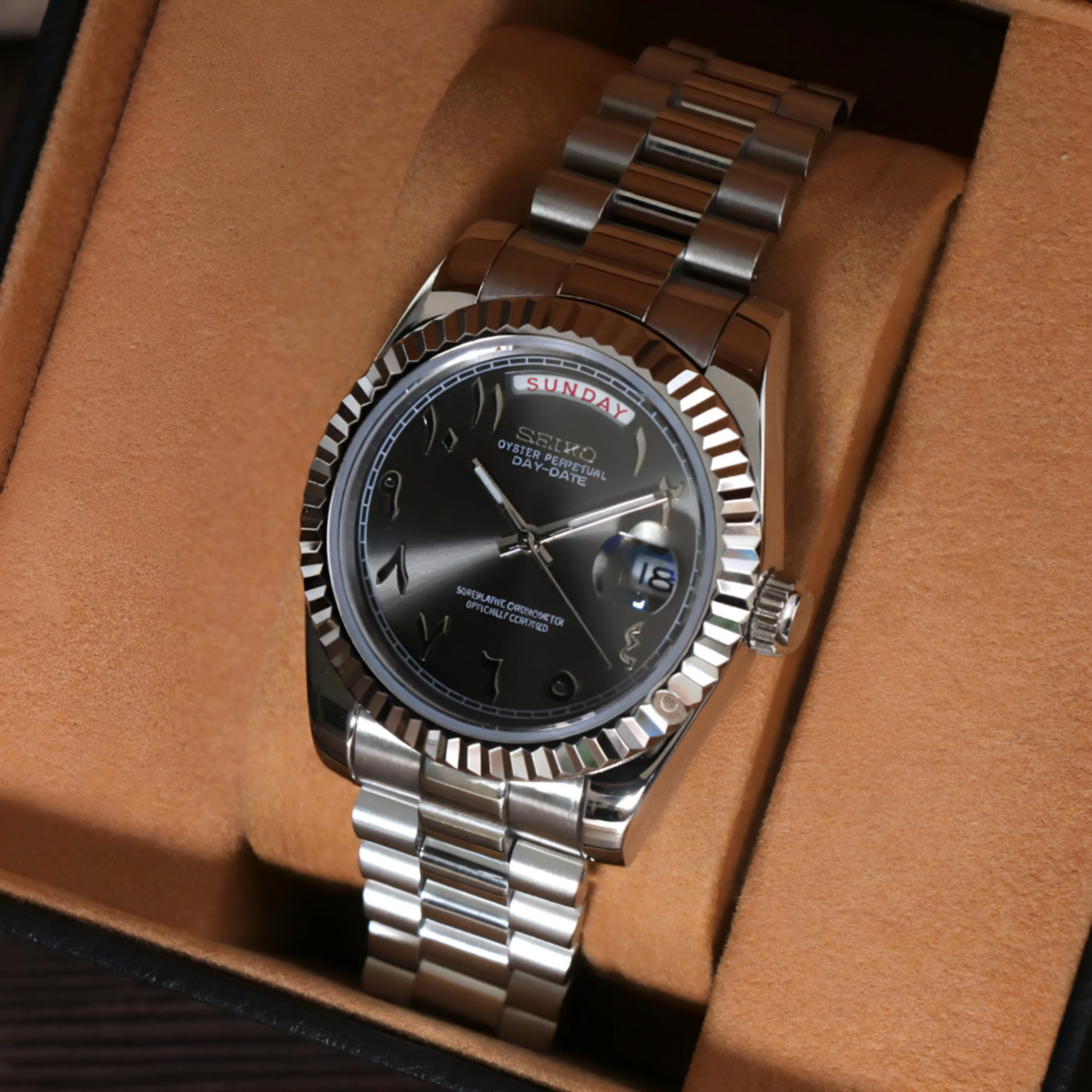 Inspired by the iconic Daydate design, and featuring the prestigious Miyota 8285 automatic movement, we present the Seiko Mod Daydate. A 39 mm high-end quality watch combining the perfect alliance between excellence and accessibility.